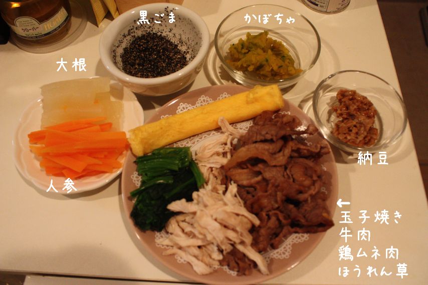材料:ごはん・ひじき(水で戻したもの)・ほうれんそう(サッと下茹でしたもの)・人参・さつまいも・豆腐・ごま・鶏ミンチ
