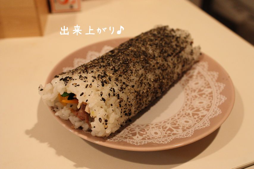 海苔で巻くと食べ難いので、ゴマでのりの代わりをしてみました!