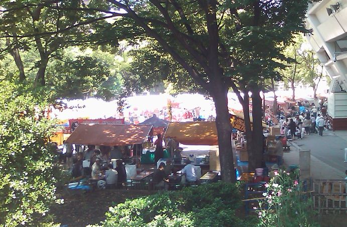 光っちゃってよく分からないんですけど、横浜公園には屋台がいっぱい出ています。